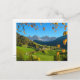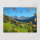 Postcard of the village of St. Magdalena or Santa Maddalena with the characteristic church in front of the Geisler or Odle Dolomites mountain peaks in the Val di Funes valley (Villnoesstal) in Italy in autumn surrounded by autumn leaves.
