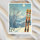 Bonjour from the snowy mountains of Val Thorens, France, in Europe! We hope you're having a wonderful ski vacation. This postcard features a gorgeous blue-grey mountain landscape with retro ski boards in an orange tribal pattern.