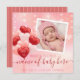 Share with family and friends the happy news of the birth of your Valentine baby with this announcement card adorned with your favorite Instagram photo. Beautiful hearts and twinkling fairy lights bead curtain background in light peach and blush pink, decorated with a bunch of heart-shaped balloons in red and various shades of vintage pink. Replace the sample photo and text with your own for a personalized gift. Simple, modern, versatile design with stripes background at the back.