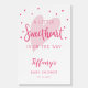 Cute valentine theme baby shower welcome sign featuring pink hearts with the text "a little sweetheart is on the way." Perfect for a girl's baby shower in Februrary.