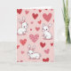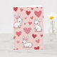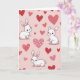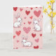 This card features three white rabbits on a light pastel pink background, surrounded by lots of hearts. Each bunny has pink inner ears, rosy cheeks, and dark eyes with tiny highlights, plus a small, sweet smile. One bunny looks off to the left, one sits upright facing forward, and another crouches low as if pausing for a moment. Hearts in red and pink are scattered all over, with a mix of solid hearts and hearts with polka dots in different sizes. There isn’t any text shown on the front, so the artwork takes center stage and keeps the focus on the characters. The overall look feels gentle, caring, and perfect for love or friendship 💘❤️.