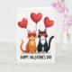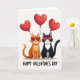 This cute card shows two cats celebrating love, like a little Valentine’s party! One is orange, the other black and white, both wearing heart-shaped sunglasses. Three red heart balloons float above them. Their soft fur and happy smiles make the scene joyful. Below, “HAPPY VALENTINE’S DAY” is written in bold black letters. Bright colors and loving characters make this card perfect for sharing Valentine’s Day cheer. ❤️❤️❤️