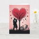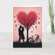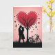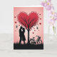 On the front of the card a couple stands close together in a gentle hug, shown as a black silhouette under a large tree. The tree’s top forms one big red heart, making the romance theme clear right away 💘. Small red hearts drift down from the heart-shaped top into a pink sky that fades from light to deeper pink. Two dark doves fly nearby, adding a calm, loving feel ❤️. In the lower area, a bicycle with a front basket sits in tall, dark grass, hinting at a sweet ride shared together. There isn’t any text visible on the card, so the picture does all the talking. The simple dark shapes against the soft pink background keep the focus on closeness and care. It’s an easy way to share Valentine’s Day sentiments with someone you love or like a lot 😘.