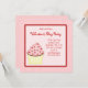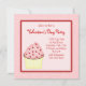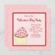 These Valentine themed invitations have a chocolate cupcake, with fluffy pink frosting, and red heart sprinkles, have a pink, heart patterned background on the border, and light pink polka dots in the center.