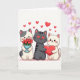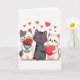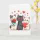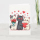 This greeting card features three adorable cartoon cats lined up on a bright white background, with small red hearts floating around them. On the left, a white cat with light gray spots holds a sky-blue flower pot filled with red heart-shaped blooms, offering them with a gentle smile. In the center, a dark gray tabby has heart-shaped eyes and presents a large plush red heart toward the cat on the right. That cat is mostly white with a soft beige tint, rosy cheeks, and a calm, happy expression as it accepts the gift. With no text on the front, the sweet scene speaks for itself. The caring gestures and warm colors make this card a lovely way to share love, friendship, or Valentine’s Day feelings with someone special ❤️💌🍫.