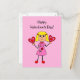 This postcard features a cute valentine girl stick figure wearing a pink dress and holding a heart in each hand. Text reads "Happy Valentine's Day". Background is light pink.