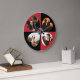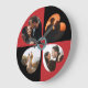 Personalized Valentine's Day large round clock with 4 heart shaped photos on red and black background .
