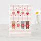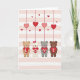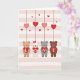 This greeting card shows four cute teddy bears standing side by side on a background of pale pink and white horizontal stripes. The bears are warm tan, creamy white, soft gray, and deep chocolate brown, and each one has a sweet, gentle expression. Every bear is holding a bright red heart close to its chest, like it’s giving a hug ❤️. On the hearts are white letters that spell out “LOVE” from left to right, with one letter on each heart. Above them, heart-shaped balloons in light pink and deep red float near the top, hanging from thin red strings, with a few small hearts scattered around 💘. The creamy white bear also wears a bright pink bow on its head, adding a simple, cute detail. It all feels cozy and romantic, perfect for a Valentine’s Day note 😘.