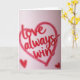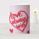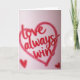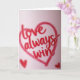 This card features the words “love always win” in bright red letters right in the center. The lettering has a flowing, handwritten look, and it stands out clearly against the soft pink background. Around the text, there’s a simple heart outline in a lighter pink, like it was lightly sketched, framing the message. The background fades gently out of focus, with a few blurry heart shapes near the bottom edges that add a sweet touch. Up close, you can notice a slight paper texture that makes it feel like a real printed card. Overall, it feels warm, hopeful, and romantic, with the message doing most of the talking 💕❤️.