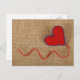 Valentine' s Day Postcard with one handmade stitched toy red heart and red twine on canvas background