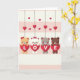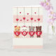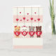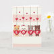 This card shows four cute cartoon bears lined up side by side, with fur in golden tan, white, gray, and brown. Each bear hugs a red heart with a single white capital letter on it, and together the hearts spell “LOVE.” The first two bears wear small red bows, and all of them have sweet faces with rosy cheeks that make them look caring and happy ❤️. Above each bear is a small red heart balloon, connected by a thin black string so the bears look like they’re gently hanging in the air. The background has soft horizontal stripes in light pink and creamy off-white, with extra little red hearts floating around. The red hearts stand out against the soft background, giving the whole scene a cozy, romantic feel 💘😘.