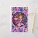 Whimsical vibrant and artistic painting with colorful confetti..Mythical love between Harlequin and Columbine,Acrylic painting inspired from Venetian feather masks and Commedia dell'arte - Venice. Bright purple pink yellow green colors.