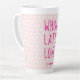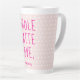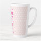 Celebrate love and friendhip with this Valentine's day latte mug, featuring the text 'Whole Latte Love' in hot pink script on a pastel pink background adorned with a pretty little hearts pattern. Personalize this heartfelt gift with your name! Exclusively designed for you by Happy Dolphin Studio.