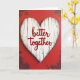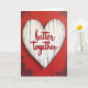 This card shows a white heart shape that looks like it’s made from worn wooden boards, with faint vertical lines and darker edges. Across the center of the heart, the words “better together” appear in flowing red writing that stands out right away. The heart sits in the middle of the card, so your eyes go straight to the message. Behind it is a deep red background with darker red spots and splatters that give it a slightly aged, textured look. Small dark specks on the heart add to the worn feel, like tiny marks from old nails or little flaws. Overall, the mix of white and red keeps it romantic and warm, and the message feels perfect for a couple or close friends