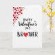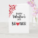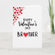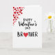 This greeting card features the words “HAPPY Valentine’s Day BROTHER” centered on a bright white background. “HAPPY” and “BROTHER” are in simple, all-capital letters, while “Valentine’s Day” is written in a flowing cursive-style font right between them. A cluster of small hearts in red and rosy pink drifts down from the upper left corner, like confetti falling into the space. One heart even replaces the “O” in “BROTHER,” turning the word into a small sign of love. The layout feels open and easy to read, with the message clearly taking the spotlight. It gives off a warm, caring feeling that works well for a brother you’re close to, whether you’re celebrating friendship or family love 🥰.