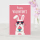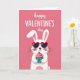 This greeting card shows a white rabbit on a solid pink background, with a calm, friendly face and light pink inside its ears. The rabbit wears red heart-shaped sunglasses with dark lenses that catch a small shine, giving it a cute, confident look. In its paws, it holds a cupcake with a teal wrapper and a swirl of pink frosting that matches the background. At the top of the card, the text reads “happy VALENTINE’S day” in white lettering, with “happy” and “day” in a flowing style and “VALENTINE’S” in thicker, simple letters. The simple layout and bright colors keep the focus on the rabbit and the sweet treat, making the whole scene feel warm and fun. It’s an easy pick for a partner, friend, or anyone you want to make smile 💘. Send it with a little note and a kiss to say you care 😘, and enjoy sharing Valentine’s Day.