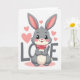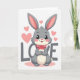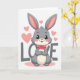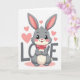 Designed with a sweet bunny as the main focus, this card has a light, romantic feel ❤️. The bunny is light grey with a white belly, pink inner ears, and small paws held together as if it’s waiting for a hug. Its big black eyes have tiny highlights, and it has pink cheeks and a small smile that looks kind and happy. Around it, several soft pink hearts float on a plain white background, adding a simple love theme 💘. A bright pink bow sits at the bunny’s neck, with a small rose in the middle of the bow. Below the bunny, there’s a light pink oval that acts like a little shadow on the ground. The word “LOVE” appears in large grey letters around the bunny, with the “L” on the left, the “E” on the right, and “OV” tucked behind the bunny in the center.