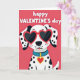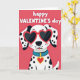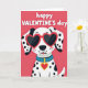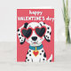 This greeting card features an adorable cartoon Dalmatian set against a bold raspberry-red background. The dog’s face is centered and full of charm, with classic black spots, floppy ears, and a cheerful, friendly expression. It wears oversized red heart-shaped sunglasses with dark lenses and a small shine that makes them stand out. Around its neck is a teal collar with a gold tag featuring a tiny red heart. Soft pink blush on the cheeks adds a warm, affectionate touch ❤️. Across the top, rounded white lettering reads “happy VALENTINE’S day,” with the mix of lowercase and uppercase giving the message extra emphasis. It’s a fun choice for dog lovers and a sweet way to share Valentine’s Day love and smiles 💌🍫.