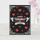 This Valentine’s Day card tells a romantic story against a deep black background that makes every detail stand out. At the center, the message “HAPPY Valentine’s DAY” appears in bold red and white lettering, with “Valentine’s” written in elegant script and accented by a small red underline. On each side of the text, two charming cupid figures hold bows and arrows, adding a classic symbol of love. A decorative white border frames the card, with ornate details in each corner for a timeless look. Small red hearts are scattered throughout the design, bringing warmth and joy. Beneath the main message, a white banner displays “14 FEBRUARY,” highlighting the special day. This card captures tradition, romance, and celebration in a beautiful way.