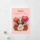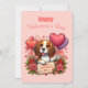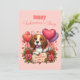 Valentine's day card featuring a beagle with flowers and heart shaped balloons.