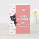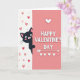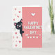 Designed with a split layout, this card shows a white panel on the left and a blush-pink panel on the right. On the white side, red and pink hearts float around in different sizes, like a light shower of confetti. A round black cat peeks in from the left, with wide eyes and a shy look, holding the edge with a small paw that has pink pads. The cat’s ears and nose are soft pink, which stands out against its dark fur and adds a sweet romantic touch ❤️. On the right side, the words “HAPPY VALENTINE’S DAY” appear in large white all-caps letters with a slight shadow, centered on the pink background. Beneath the text, a white arrow points across the card, and five tiny hearts sit along it, with one heart in pale pink among the white ones 💘. It feels like a simple, cute way to say “I’m thinking of you,” and it’s perfect for sharing Valentine’s Day sentiments.