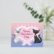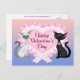 Valentine's Day Cats postcard features a pink and violet gradient background, with a white and gray cat wearing a pink heart on it's collar, a black cat with a white tip on it's tail, wearing a pink heart on it's collar. The cats are sitting in front of a pink heart with white lace and a white and pink bow. Stylized dark dark pink text is Happy Valentine's Day! Perfect for Valentine's Day mailings. Matches our Address labels and Postage.