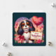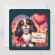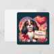 Valentine's day card featuring a Cavalier King Charles with flowers and heart shaped balloons.