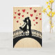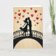 This card shows a couple in black silhouette sharing a kiss on a gently arched bridge. The bridge has curled iron rail details, giving the scene an old-fashioned, romantic feel. Behind them is a light, wood-grain background in soft tan tones that makes the dark figures stand out. The woman holds a small handbag at her side, which adds a sweet, everyday touch to the moment. Red hearts float above and around the couple in different sizes, like little bursts of love in the air ❤️. There isn’t any printed message or lettering on the front, so the picture does all the talking and leaves room for your own words inside. It feels meaningful because it captures that quiet closeness you share with someone special, whether it’s a partner or a dear friend 🥰.
