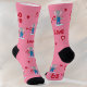 Some cute pink Valentine's Day crew socks with the pattern of a cartoon elephant , red and pink hearts and the word "Love" .