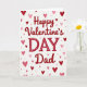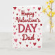 This Valentine's Day card features the message “Happy Valentine’s DAY Dad” front and center in deep red on a white background. The words look like a mix of smooth, flowing letters and thicker, simple letters, making the greeting easy to read and full of warmth. “DAY” stands out with an outlined look and soft pink stripes inside the letters, giving it a fun little detail. All around the text, red and pink hearts of different sizes are scattered like confetti, with some darker and some lighter tones. The hearts have a slightly brushed texture, which makes them feel soft and friendly rather than stiff. It feels meaningful because it keeps the focus on love and thanks for Dad without needing anything complicated 🥰. Overall, it’s a sweet way to pause and say “I care about you” on Valentine’s Day ❤️, and it ends with a friendly note for sharing Valentine’s Day sentiments.