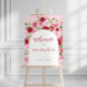 Valentine's Day themed welcome sign with a pink and red watercolor floral arch and elegant script font