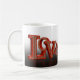 Valentine's day gift Love mug. The word LOVE in graphic design of red with stripes and floral design. Modern style motif.