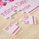 Four gnomes holding letters that spell out the word "LOVE" over a pink stripe background.
