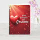 This greeting card shows a deep red background that fades through darker and lighter shades, with a soft golden glow coming from the upper left. Tiny light specks and pale rays spread across the scene, giving it a gentle, cozy look. A large shiny red heart sits just left of center, rounded and slightly 3D, like it’s meant to feel full and warm. On the heart, there are thin white swirls and small heart outlines that look like delicate pen strokes. Smaller hearts in red and pale pink float all around, filling the space without feeling crowded. On the right side, the text reads “HAPPY Valentine’s DAY Grandma” in white, with “HAPPY Valentine’s DAY” in simple letters and “Grandma” in a flowing cursive style. It feels meaningful because it’s clearly made for a grandma you care about, and the hearts and warm light make the message feel close and loving 🥰❤️.