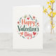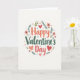 This card features the words “Happy Valentine’s Day” in the center, surrounded by a loose circle of flowers, leaves, and little hearts. “Happy” and “Day” are in a warm coral color, while “Valentine’s” is in a muted forest green that stands out nicely. The lettering mixes rounded, bouncy print with a smoother cursive look, giving it a friendly, romantic feel. Around the message, you’ll see blush-pink flowers with darker centers, thin green sprigs, and tiny pale-blue star shapes tucked in between. Hearts in red, peach, and simple outlines are scattered through the wreath, like little reminders of love❤️. The background is a creamy off-white, which keeps everything soft and easy on the eyes. It feels meaningful to give because it’s sweet without being over the top, and it works for a partner or a close friend🥰.