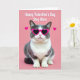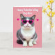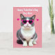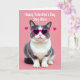 This card shows a fluffy grey-and-white cat facing forward on a soft rose-pink background. The cat looks calm and a little funny, with heart-shaped sunglasses in bright fuchsia that cover its eyes. The lenses are dark, which makes the cat’s white muzzle, pink nose, and long white whiskers stand out. Above the cat, the message “Happy Valentine’s Day Step Mom” appears in white letters near the top of the card. Two small hot-pink hearts sit around the words, matching the color of the sunglasses. The simple scene feels sweet and caring, like a light, affectionate way to say “I’m thinking of you.” It’s a meaningful choice for a step mom because it mixes warmth with a gentle sense of humor 🥰❤️.