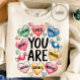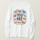 This uplifting Valentine design surrounds gentle heart illustrations with powerful affirmations like strong, loved, brave, and worthy. Soft colors and positive words create a meaningful reminder of self-love, confidence, and inner strength for everyday wear.