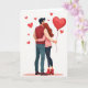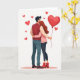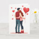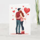 This cute card shows a couple hugging closely, seen from behind, on a plain white background. The man has short dark hair and wears a light blue top as he wraps his arms around the woman. She has long auburn hair resting against his shoulder, and her relaxed posture makes the moment feel calm and caring. Small red hearts float upward above them, adding a sweet touch of love ❤️. On the right side, she holds a large red heart-shaped balloon that stands out clearly against the white space 💌. Their outfits are in soft blues, while the hearts and balloon are bright reds and pinks, with a light pink shadow under their feet. There isn’t any printed message or lettering on the front, so the image carries the feeling on its own 🍫.