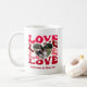 Celebrate love this Valentine's Day with a custom mug featuring the word "Love" in red tones and a heart design showcasing your favorite photo. Add a personal touch by including the couple's names for a meaningful gift for a girlfriend or wife.