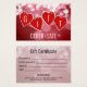 Romantic illustration featuring hanging red hearts with "GIFT" letters on a bokeh background.