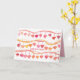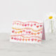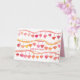 Happy Valentine's Day greetings decorated with rows of dangling hearts in shades of pink and orange with spatter spots illustrated with watercolor. On the inside is a warm shade of pink and another single heart with text that you can change to fit your needs.