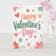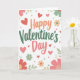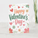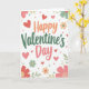 This greeting card features the words “Happy Valentine’s Day” stacked in the center in a casual hand-lettered style. “Happy” is in warm coral, “Valentine’s” is in soft sage green, and “Day” is in a gentle blush pink, all set on a white background. Around the text, small and medium hearts in rosy pink and deeper red float like confetti. Simple flowers in dusty rose, pale mint, and a soft golden tone sit between the hearts, with little green leaves tucked in. Tiny starburst marks fill a few open spaces, giving the layout a light, cheerful feel without looking busy. The overall look is sweet and calm, making it easy to give to a partner, friend, or anyone you care about 🥰. It feels meaningful because the message is clear and surrounded by small signs of love that echo what you might not say out loud ❤️. Hope it helps you share your Valentine’s Day sentiments.