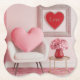 This is a pretty pink MCM Art Valentine's Day Coaster Set. The Valentine design was created with generative art. The art style is Mid Century Modern. The art features a digital photo of a room with a pink heart shaped pillow in a white chair, pink flowers in a red vase, the word Love in a red and silver heart in a silver frame on the wall, a pink wall and a pink carpet. The coaster is a bracket shaped paper board coaster. There are 6 coasters in the set.