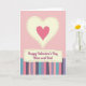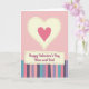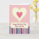 This card shows a large creamy yellow heart in the center, outlined with little dashed stitch marks, with a smaller rose-pink heart sitting inside it. The background is a pale pink gingham pattern that feels cozy and gentle. Below the hearts, there’s a stitched-style banner with the words “Happy Valentine’s Day Mom and Dad” printed across it. The lettering is a smooth, cursive look in a dark color, and it’s easy to read against the light banner. The bottom third of the card is filled with vertical stripes in muted lavender, dusty rose, soft teal, and deeper mauve, each with a lightly woven look. Together, the hearts, stitches, and soft patterns make the card feel caring and close, like a quiet hug ❤️. It’s a meaningful way to thank your parents for their love and support, and it’s easy to give with a smile 🥰 while sharing Valentine’s Day sentiments.