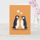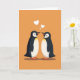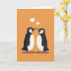 This card shows two penguins facing each other in the center on a warm orange background. Their beaks nearly touch, and their eyes are closed as if they’re sharing a quiet, happy moment ❤️. Each penguin has dark indigo-black feathers with creamy white bellies that fade into a soft golden-yellow on the chest. Their beaks and webbed feet are bright orange, and there’s a light blush on their cheeks that makes them look extra sweet 😘. Three white hearts float above their heads, getting smaller as they rise, making the love theme clear 💘.