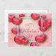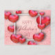 Happy Valentine's Day festive sparkle glitter light pastel pink rose background illustration with red realistic 3D hearts and white frame. Text written in modern script letters.