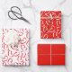 Valentine's Day holiday graphic art with one red heart repeated randomly at different rotations to create a random open heart pattern. The set of three includes; one sheet with red hearts on a white background, one sheet with white hearts on a red background, and one sheet that is solid red. These are fun for gift wrapping, party decorations, and crafts.