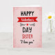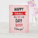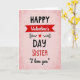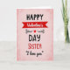 This card shows a soft blush pink background with a light speckled texture, like paper you’d want to hold. The message is stacked down the center, starting with “HAPPY” in black, simple all-caps letters at the top. Right under it, “Valentine’s” appears in white flowing letters laid across a deep red ribbon banner with pointed ends. Below that, “DAY” is in black all-caps again, and a small red heart sits between two black curled flourishes like little decorations. Near the bottom, “SISTER” stands out in rounded red letters, making it clear who the card is for. The final line reads “I love you” in a casual black handwritten-style line with quotation marks, placed at the very bottom. It feels meaningful because it says something direct and caring without trying too hard, perfect for showing your sister she matters 🥰❤️.