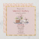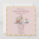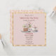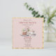 A pretty teacup, piece of cake and vase of pink roses complete the pretty invitation encircled in a gold color square frame.