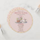 A pretty teacup, piece of cake and vase of pink roses complete the pretty invitation encircled in a gold color round frame.